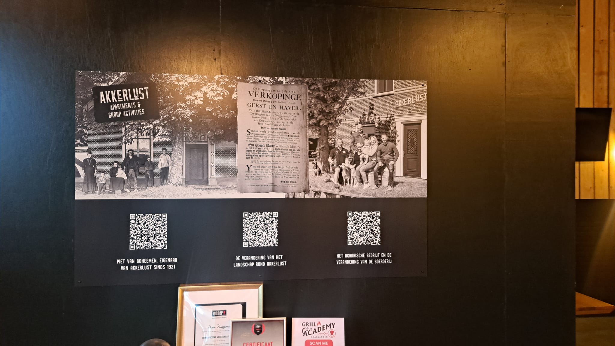 Is ook aan de straatzijde aangebracht , t.b.v. de voorbijgangers en gaat over het agrarische bedrijf en de verandering van de boerderij. Hierbij zie je de authentieke koeienstal gebouwd ongeveer 1930 en de open front ligboxenstal van 1996.
